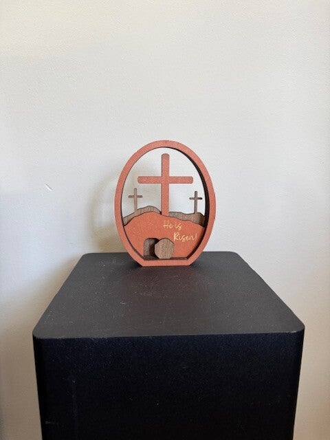 Deze prachtige houten afbeelding van het kruis vertelt het Paasverhaal in één oogopslag. In een eivormig frame zie je drie kruizen op de heuvel, met een open graf en de hoopvolle boodschap: "He is Risen".